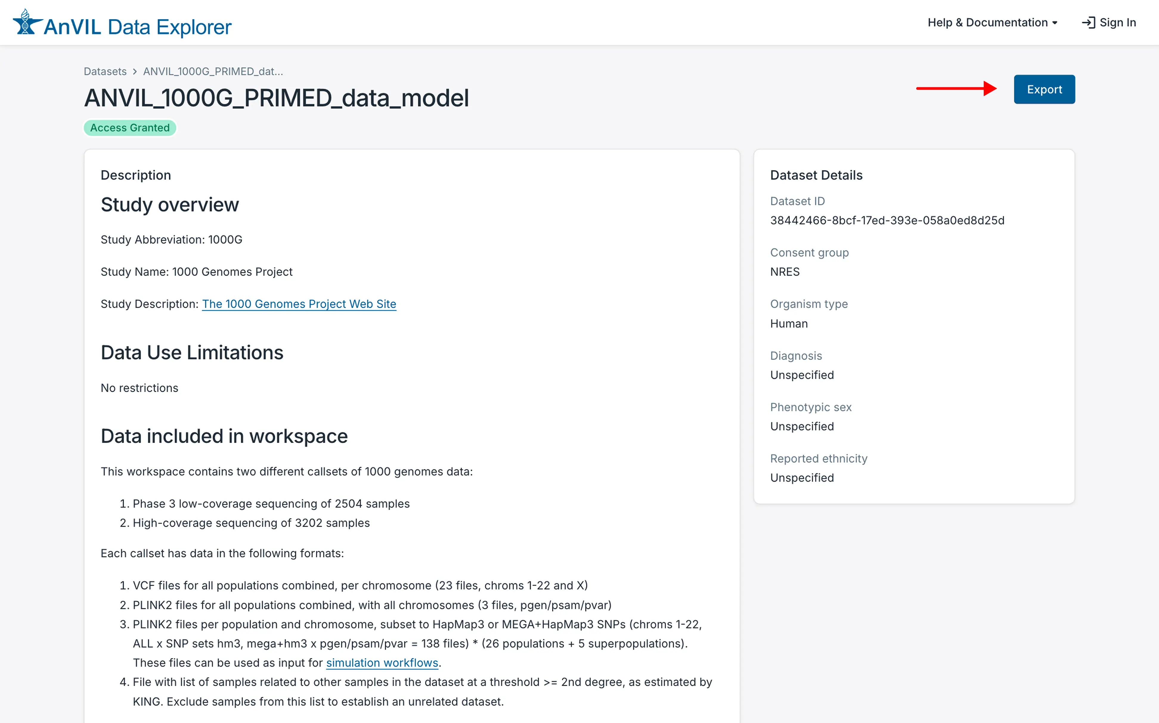 - On the dataset description page, click on the "Export" button in the upper right-hand corner of that page.