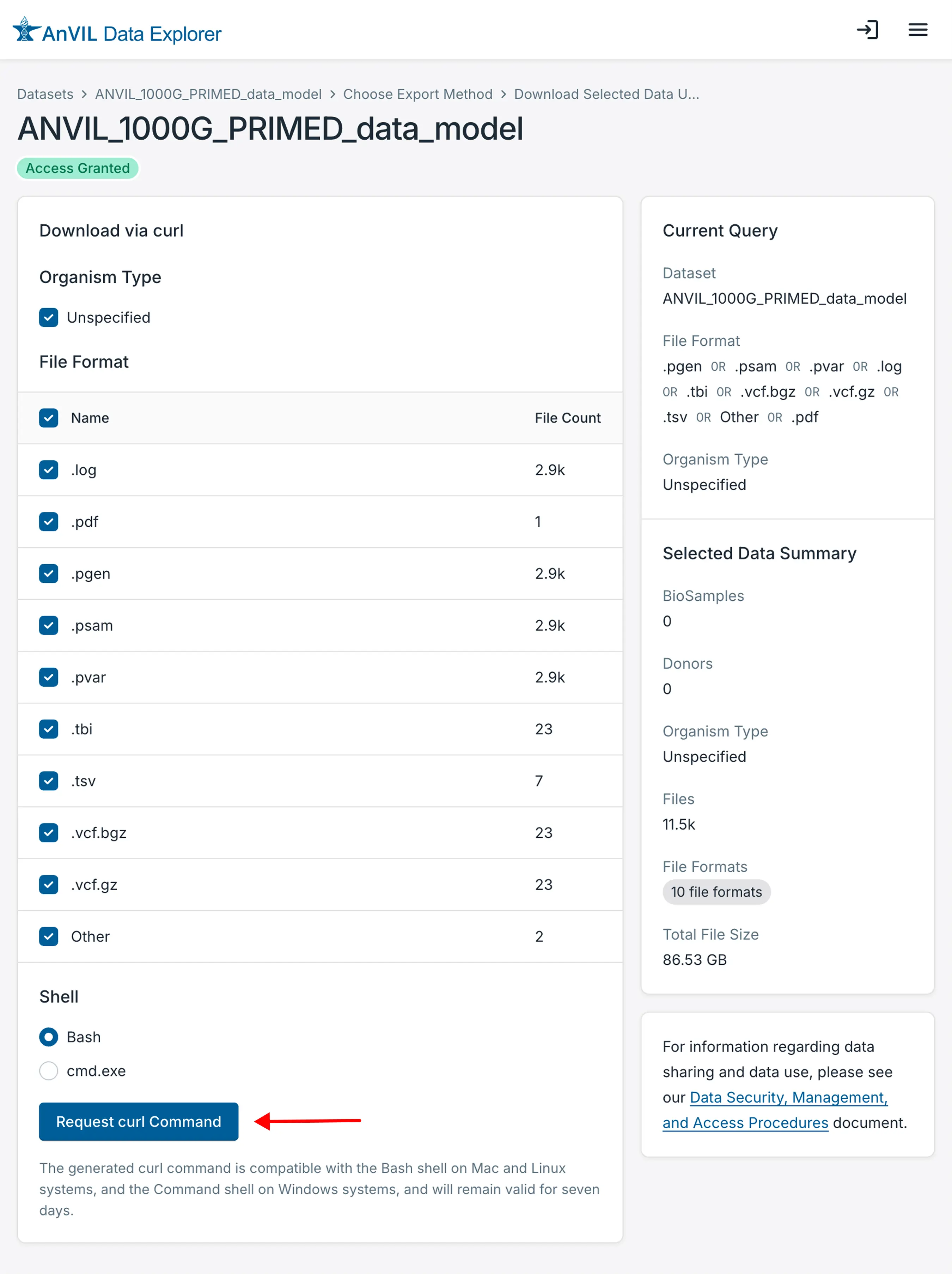 The Download Open-Access Data (curl Command) enables the user to select the organism type and file formats they wish to transfer to a local or institutional system. Complete datasets can be downloaded by selecting all available file types.